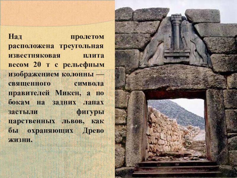 изображением колонны — священного символа правителей Микен, а по бокам на задних лапах застыли фигуры царственных львов, как бы охраняющих Древо жизни.