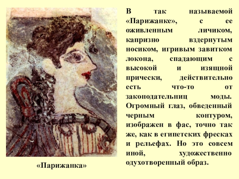 игривым завитком локона, спадающим с высокой и изящной прически, действительно есть что-то от законодательниц моды. Огромный глаз, обведенный черным контуром, изображен в фас, точно так же, как в египетских фресках и рельефах. Но это совсем иной, художественно одухотворенный образ.