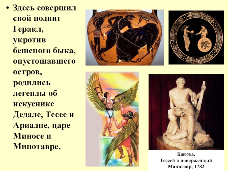легенды об искуснике Дедале, Тесее и Ариадне, царе Миносе и Минотавре.