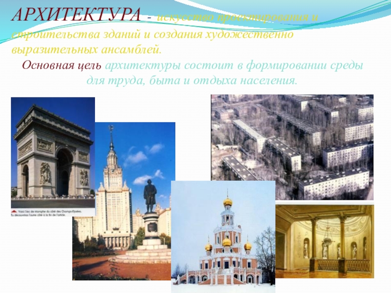 Слайд 15АРХИТЕКТУРА - искусство проектирования и строительства зданий и создания художественно выразительных