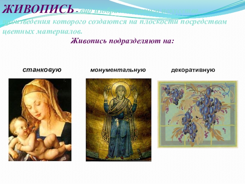 Слайд 9ЖИВОПИСЬ - вид изобразительного искусства, произведения которого создаются на плоскости посредством