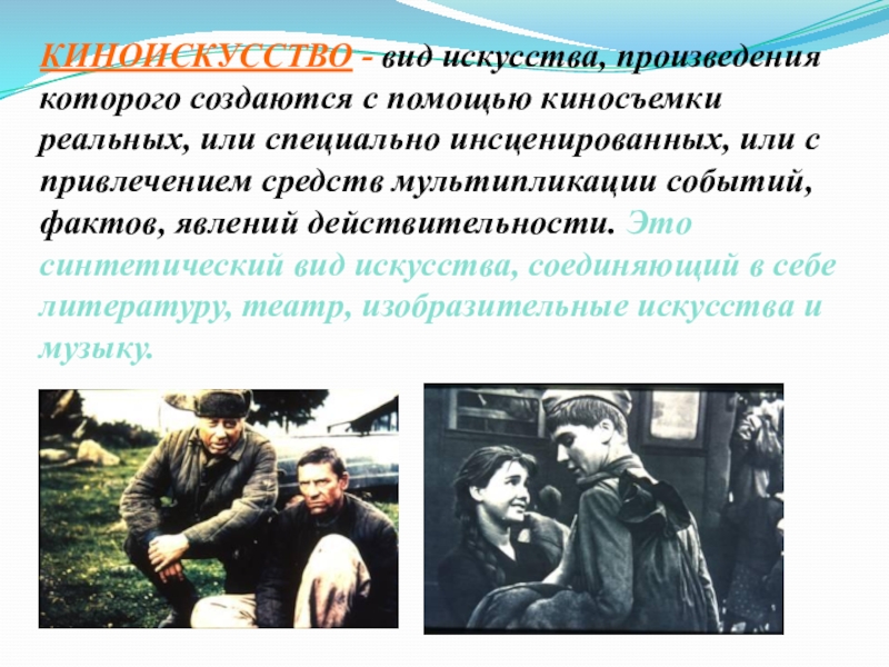 Слайд 22КИНОИСКУССТВО - вид искусства, произведения которого создаются с помощью киносъемки реальных,