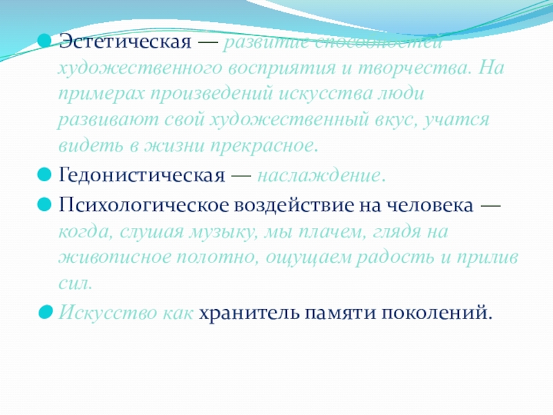Слайд 5Эстетическая — развитие способностей художественного восприятия и творчества. На примерах произведений