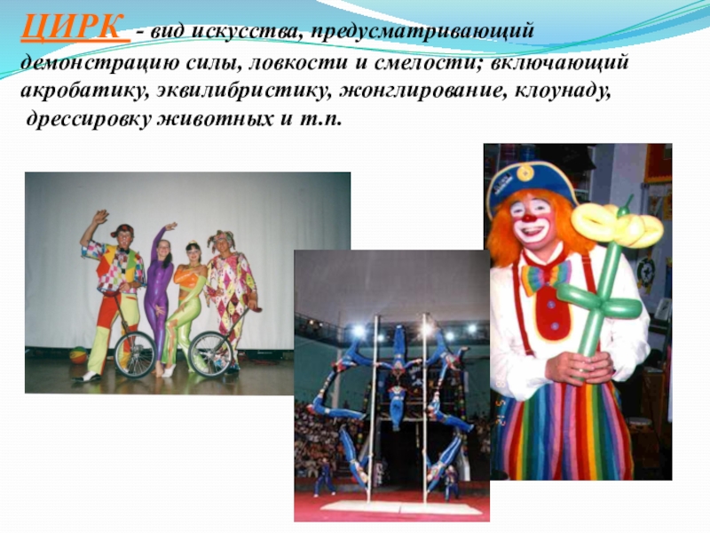 Слайд 25ЦИРК - вид искусства, предусматривающий демонстрацию силы, ловкости и смелости; включающий
