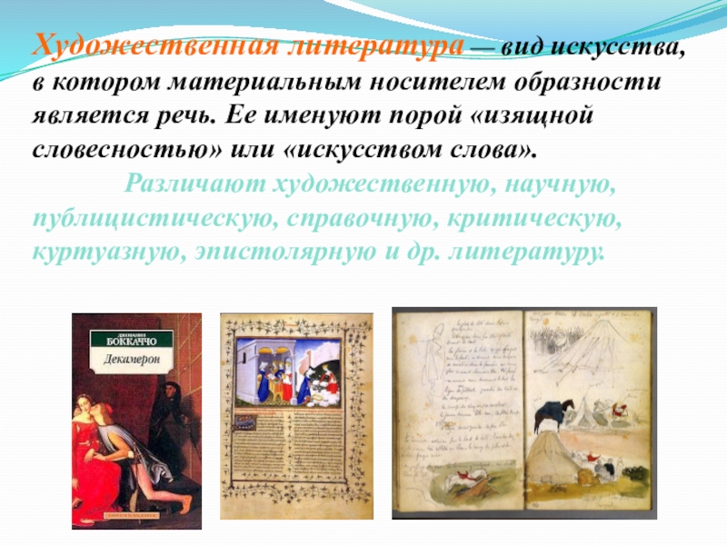 Различают художественную, научную, публицистическую, справочную, критическую, куртуазную, эпистолярную и др. литературу.