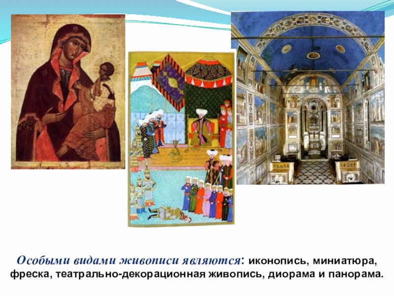 Слайд 10Особыми видами живописи являются: иконопись, миниатюра, фреска, театрально-декорационная живопись, диорама и