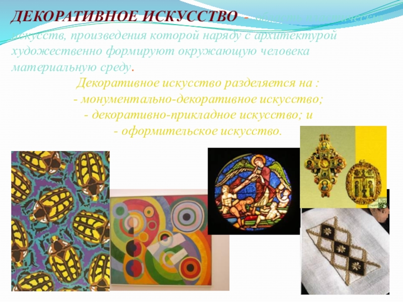 Слайд 16ДЕКОРАТИВНОЕ ИСКУССТВО - область пластических искусств, произведения которой наряду с архитектурой