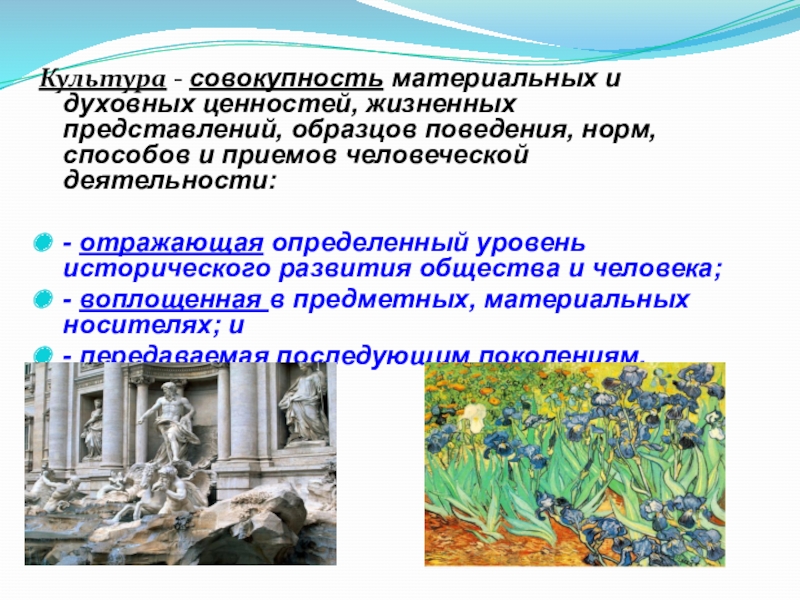 Культура - совокупность материальных и духовных ценностей, жизненных представлений, образцов поведения,