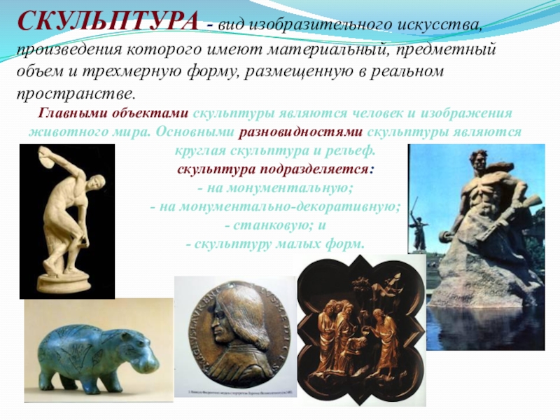 Главными объектами скульптуры являются человек и изображения животного мира. Основными разновидностями скульптуры являются круглая скульптура и рельеф.