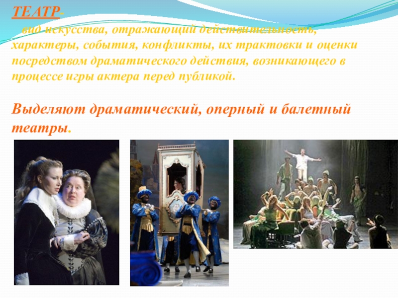 Выделяют драматический, оперный и балетный театры.