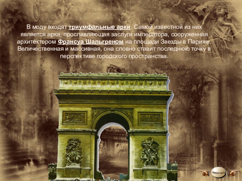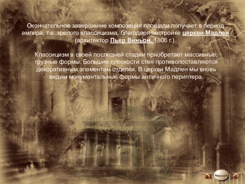 Классицизм в своей последней стадии приобретает массивные, грузные формы. Большие плоскости стен противопоставляются декоративным элементам отделки. В церкви Мадлен мы вновь видим монументальные формы античного периптера.