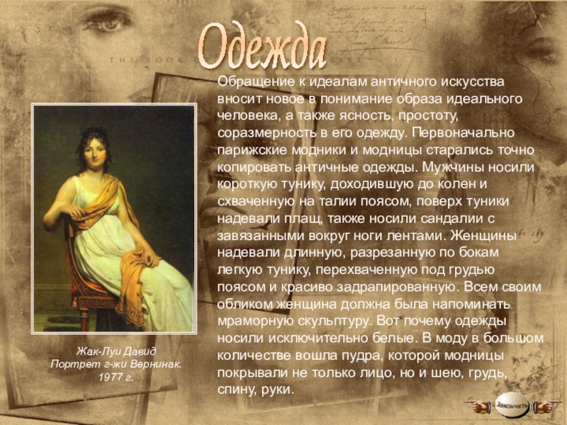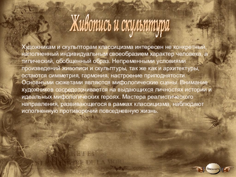 Вдохновленный искусством Античности и Ренессанса, художник изображает идеального героя, не теряющего в любых испытаниях самообладания, веры в себя, готовности к подвигу.