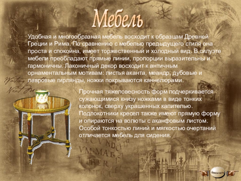 Прочная тяжеловесность форм подчеркивается сужающимися книзу ножками в виде тонких колонок, сверху украшенных капителью. Подлокотники кресел также имеют прямую форму и опираются на волюты с аканфовым листом. Особой тонкостью линий и мягкостью очертаний отличается мебель для сидения.
