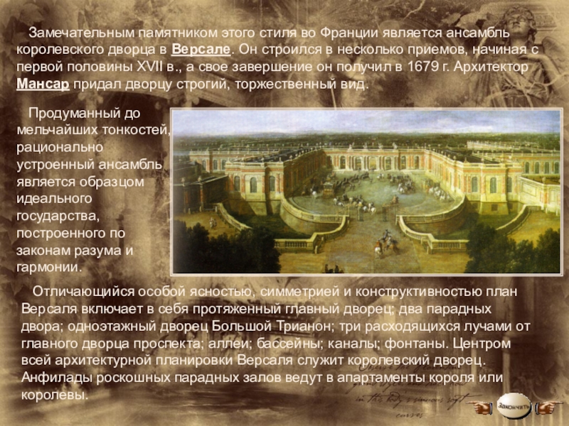 Продуманный до мельчайших тонкостей, рационально устроенный ансамбль является образцом идеального государства, построенного по законам разума и гармонии.