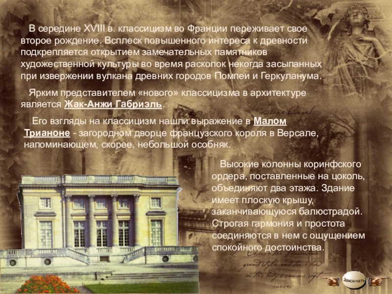 Его взгляды на классицизм нашли выражение в Малом Трианоне - загородном дворце французского короля в Версале, напоминающем, скорее, небольшой особняк.