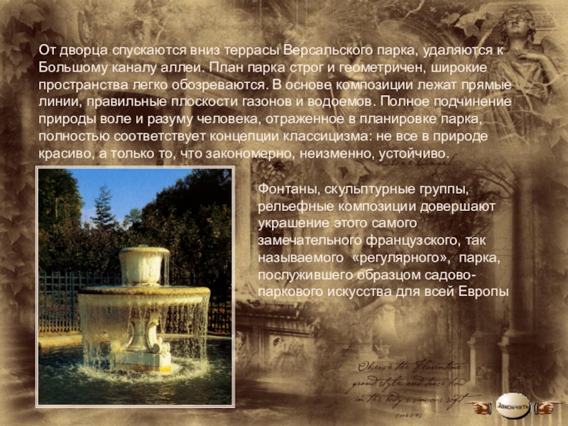 Фонтаны, скульптурные группы, рельефные композиции довершают украшение этого самого замечательного французского, так называемого «регулярного», парка, послужившего образцом садово-паркового искусства для всей Европы