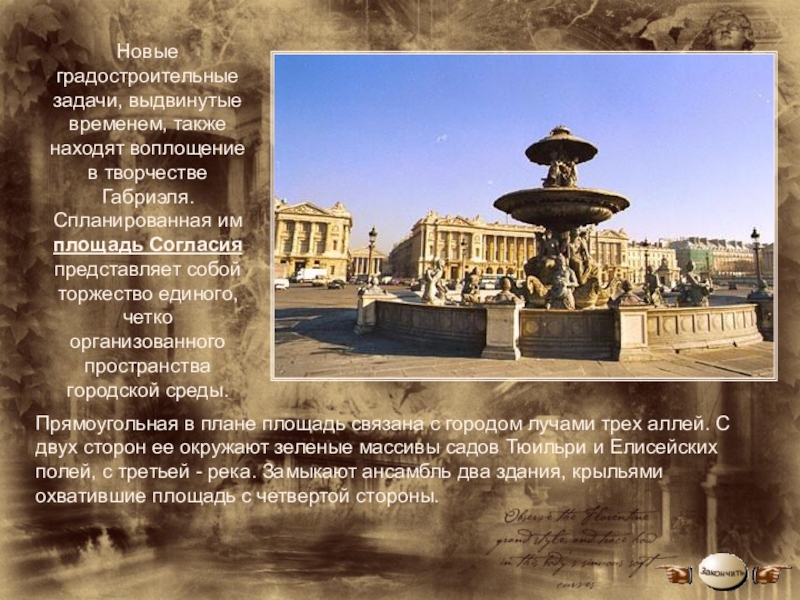 Новые градостроительные задачи, выдвинутые временем, также находят воплощение в творчестве Габриэля. Спланированная им площадь Согласия представляет собой торжество единого, четко организованного пространства городской среды.