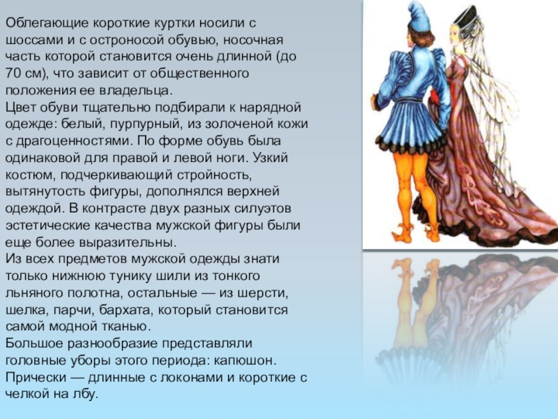 Цвет обуви тщательно подбирали к нарядной одежде: белый, пурпурный, из золоченой кожи с драгоценностями. По форме обувь была одинаковой для правой и левой ноги. Узкий костюм, подчеркивающий стройность, вытянутость фигуры, дополнялся верхней одеждой. В контрасте двух разных силуэтов эстетические качества мужской фигуры были еще более выразительны.