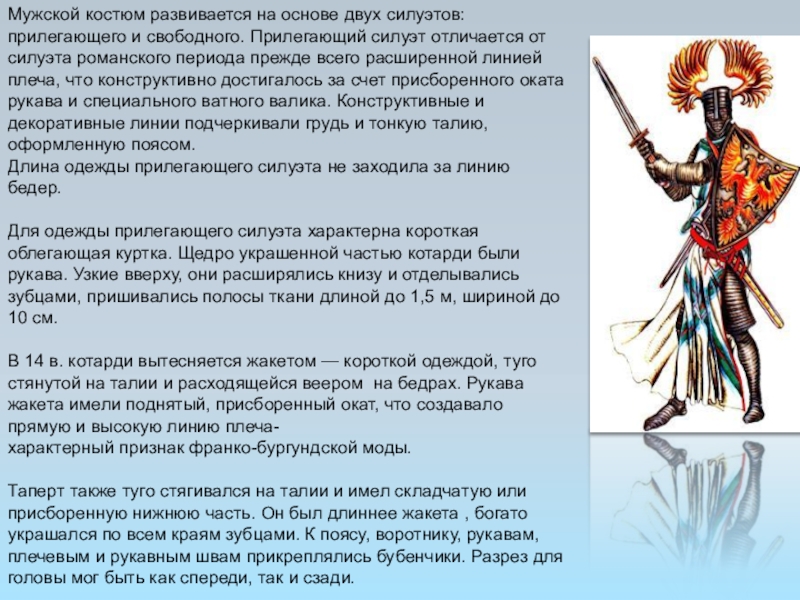 В 14 в. котарди вытесняется жакетом — короткой одеждой, туго стянутой на талии и расходящейся веером на бедрах. Рукава жакета имели поднятый, присборенный окат, что создавало прямую и высокую линию плеча-