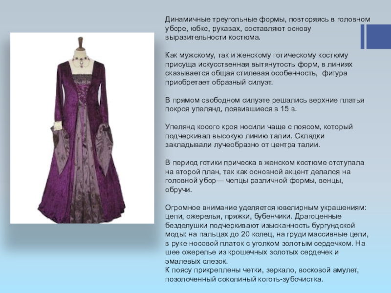 одежде. В костюме готики, как и в остальных видах искусства этого периода, есть две противоречивые тенденции: закрыть тело, нивелировать его формы, как того требует христианская мораль, и обтянуть фигуру узким кроеным костюмом, подчеркнуть красоту естественных форм человеческой фигуры.