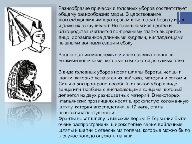 Слайд 18Разнообразие причесок и головных уборов соответствует общему разнообразию моды. В царствование