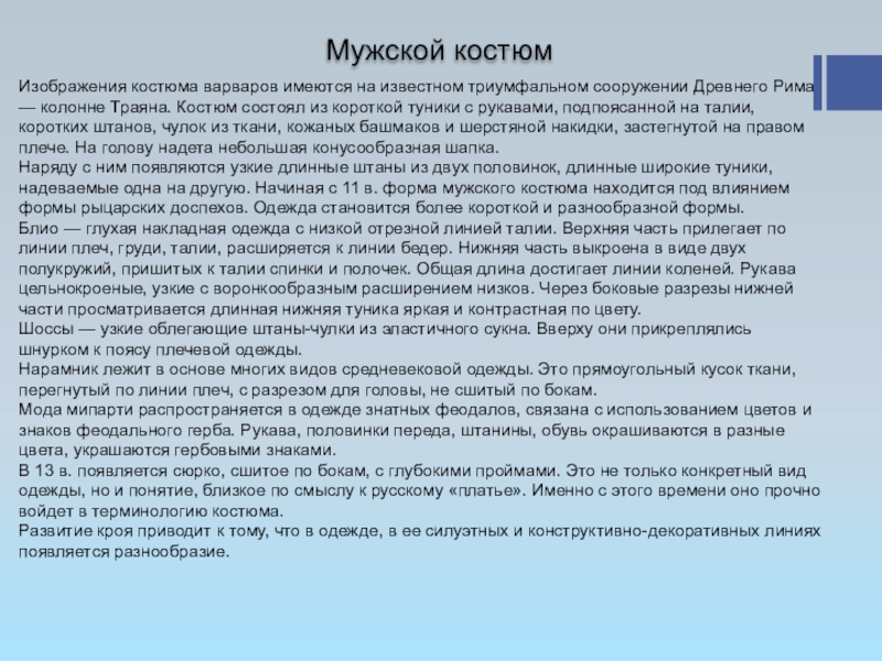 Слайд 7Мужской костюм развивается на основе двух силуэтов: прилегающего и свободного. Прилегающий