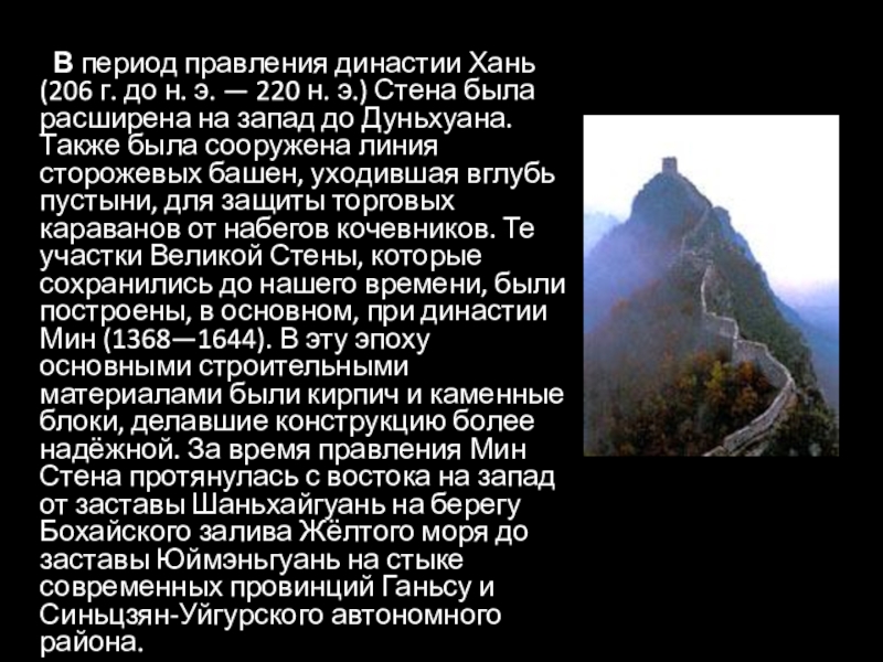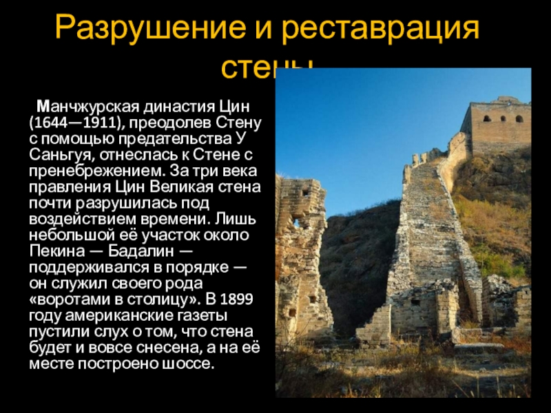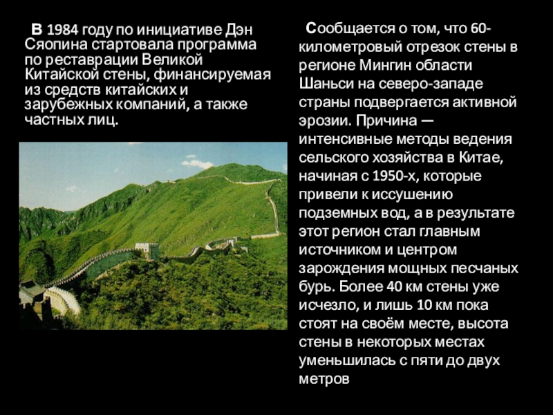 Сообщается о том, что 60-километровый отрезок стены в регионе Мингин области Шаньси на северо-западе страны подвергается активной эрозии. Причина — интенсивные методы ведения сельского хозяйства в Китае, начиная с 1950-х, которые привели к иссушению подземных вод, а в результате этот регион стал главным источником и центром зарождения мощных песчаных бурь. Более 40 км стены уже исчезло, и лишь 10 км пока стоят на своём месте, высота стены в некоторых местах уменьшилась с пяти до двух метров