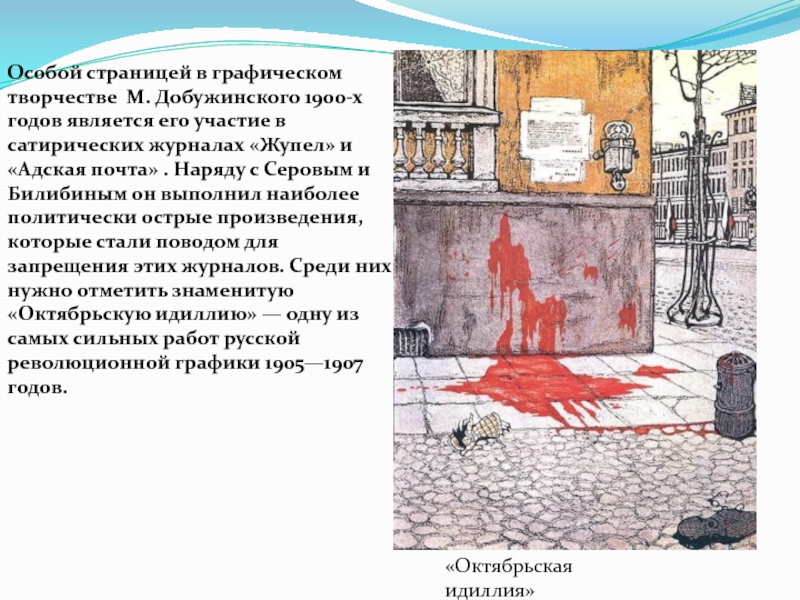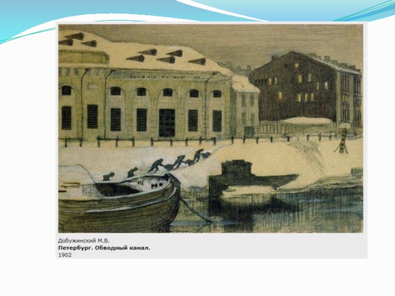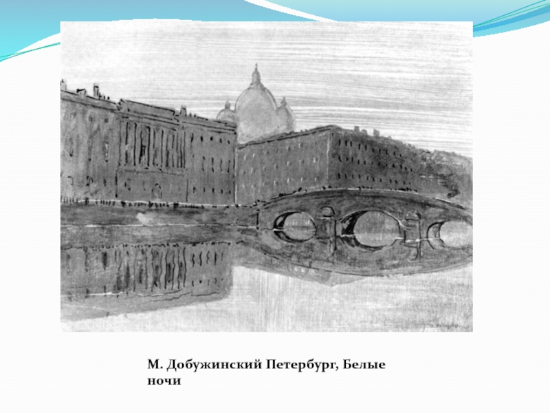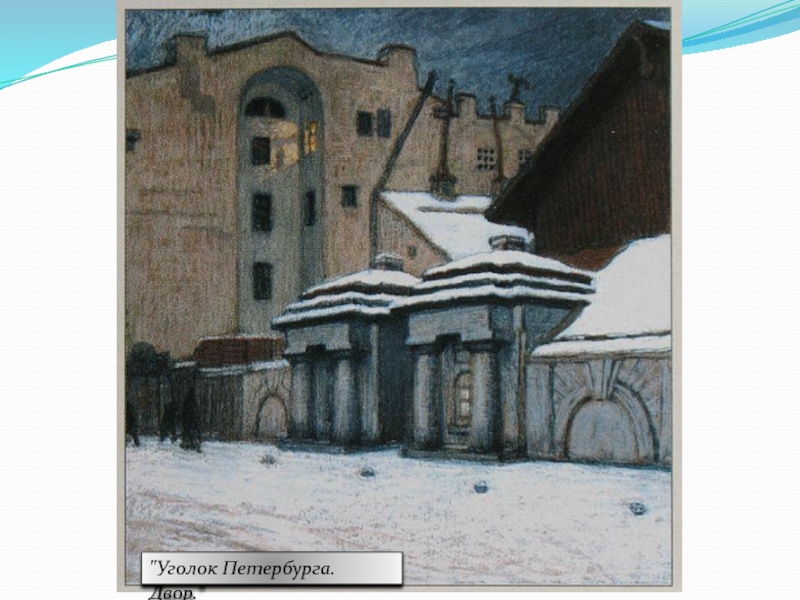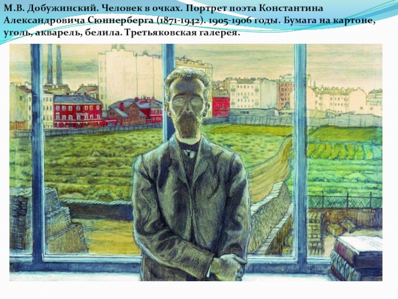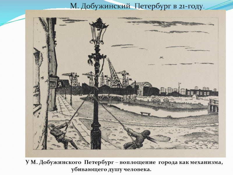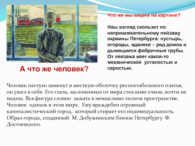 Человек наглухо замкнут в жесткую оболочку респектабельного платья, он ушел в себя. Его глаза, заслоненные от мира стеклами очков, почти не видны. Вся фигура словно зажата в немыслимо тесном пространстве. Человек одинок в этом мире. Ему враждебен огромный капиталистический город, который стирает его индивидуальность. Образ города, созданный М. Добужинским близок Петербургу Ф. Достоевского.
