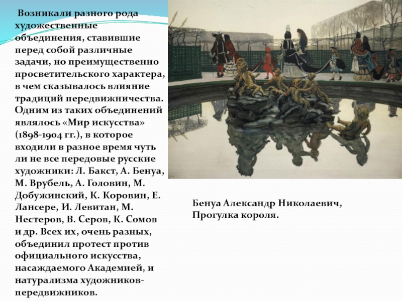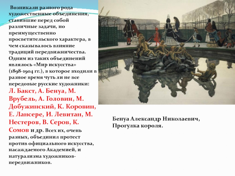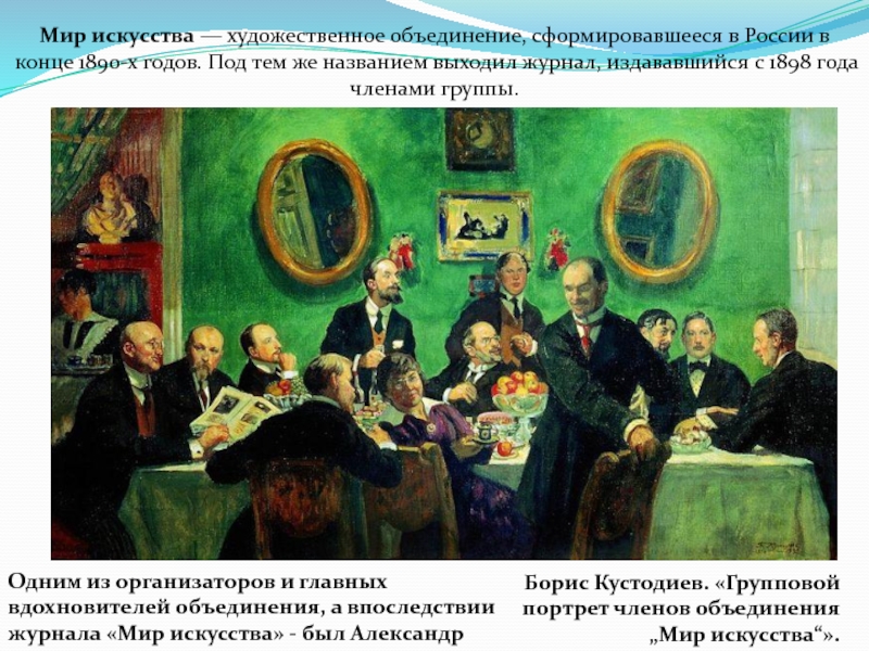 Одним из организаторов и главных вдохновителей объединения, а впоследствии журнала «Мир искусства» - был Александр Бенуа.