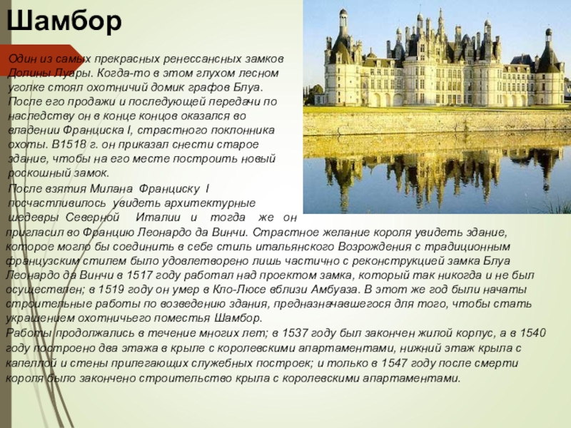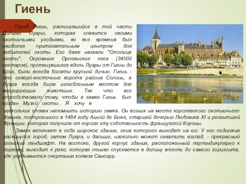 Город Гиень, раскинувшийся в той части Долины Луары, которая славится своими охотничьими угодьями, во все времена был наиболее притягательным центром для любителей охоты. Его даже назвали "Столица охоты". Огромные Орлеанские леса (34000 гектаров), протянувшиеся вдоль Луары от Гиени до Боса, были всегда богаты крупной дичью. Гиень - это северо-восточные ворота района Солонь, а Луара всегда была излюбленным местом для мигрирующих животных. Так что все способствовало тому, чтобы в замке Гиень был создан Музей охоты . Я хочу в