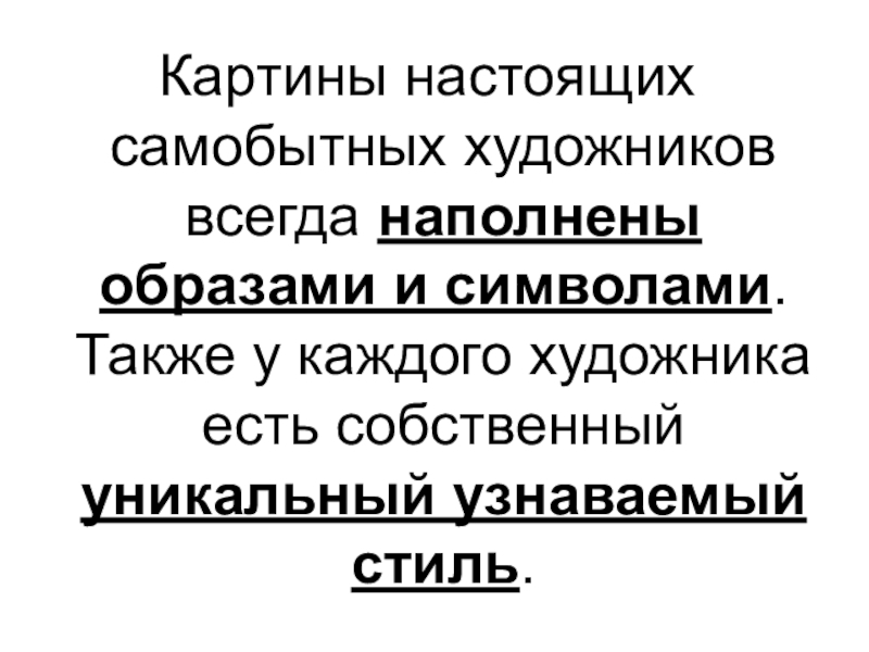 Слайд 5Картины настоящих самобытных художников всегда наполнены образами и символами. Также у