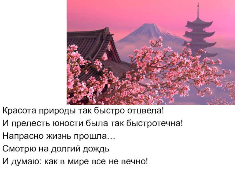 Красота природы так быстро отцвела!И прелесть юности была так быстротечна!Напрасно жизнь прошла… Смотрю на долгий дождь И
