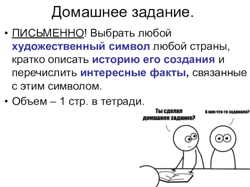 Домашнее задание.ПИСЬМЕННО! Выбрать любой художественный символ любой страны, кратко описать историю его создания и перечислить интересные факты,