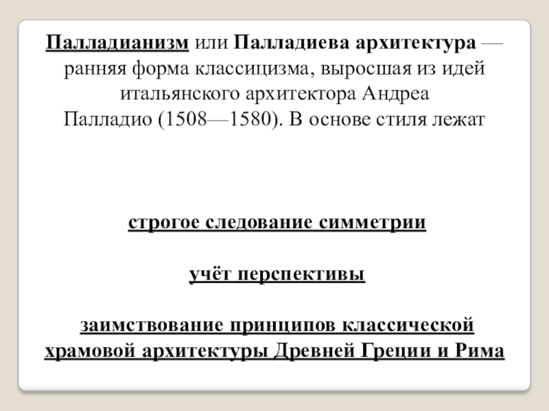 Слайд 5Палладианизм или Палладиева архитектура — ранняя форма классицизма, выросшая из идей итальянского архитектора Андреа Палладио (1508—1580). В
