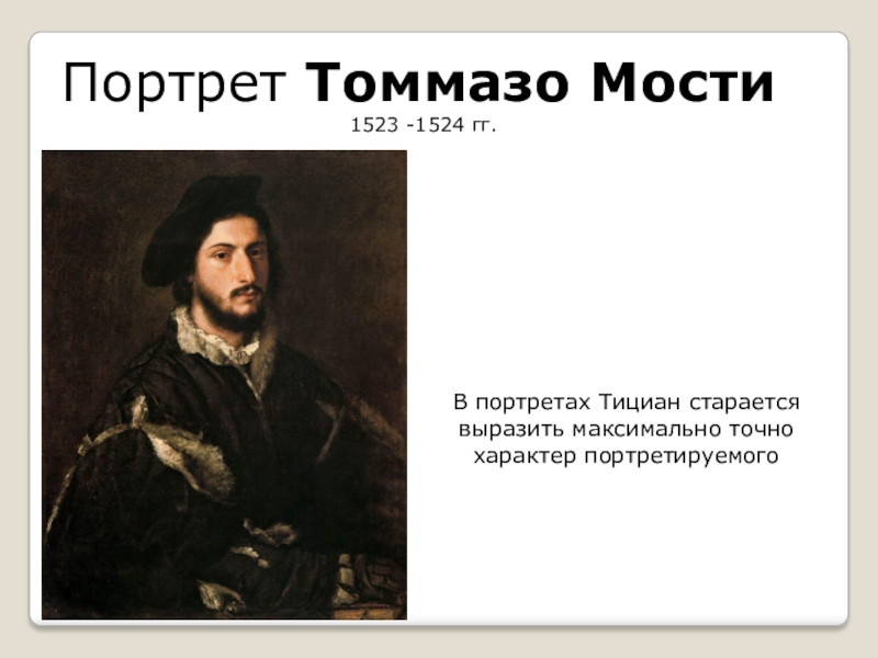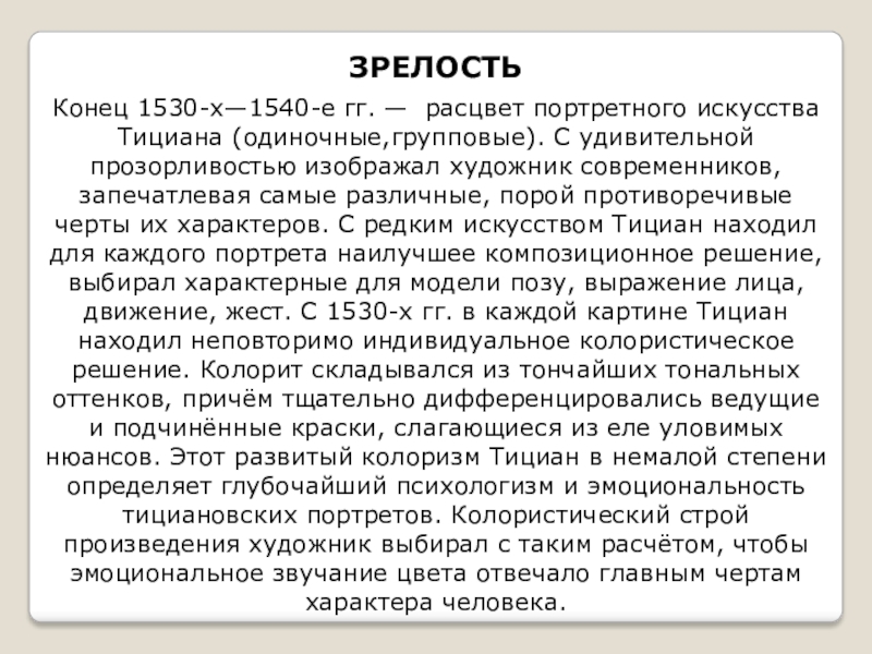 Конец 1530-х—1540-е гг. — расцвет портретного искусства Тициана (одиночные,групповые). С удивительной прозорливостью
