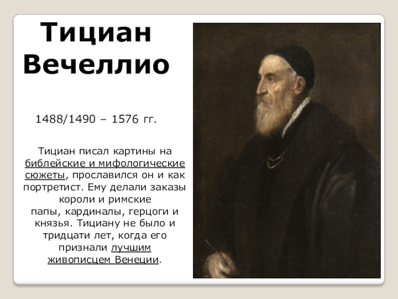 прославился он и как портретист. Ему делали заказы короли и римские папы, кардиналы, герцоги и князья. Тициану не было и тридцати лет, когда его признали лучшим живописцем Венеции.