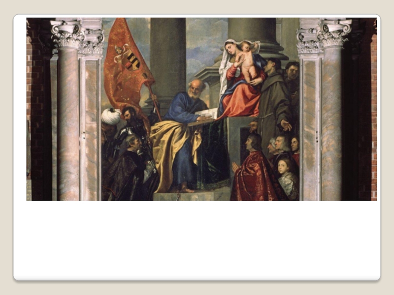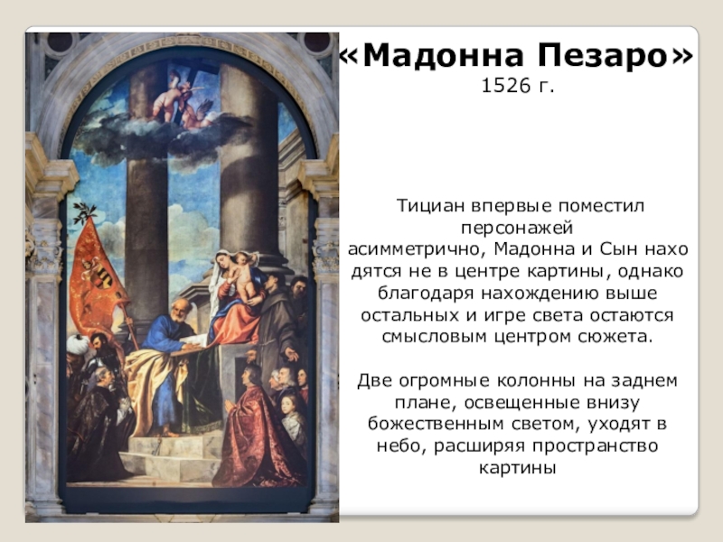 Тициан впервые поместил персонажей асимметрично, Мадонна и Сын находятся не в центре