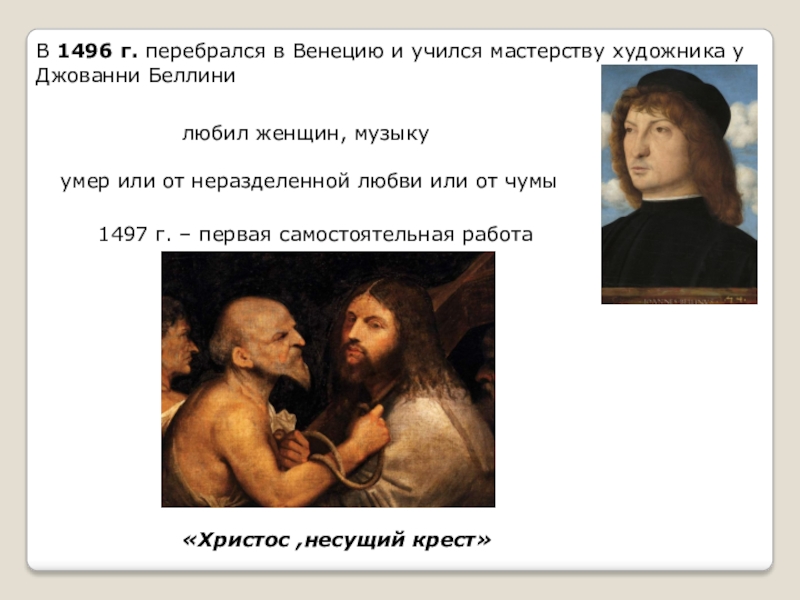 Слайд 19В 1496 г. перебрался в Венецию и учился мастерству художника у