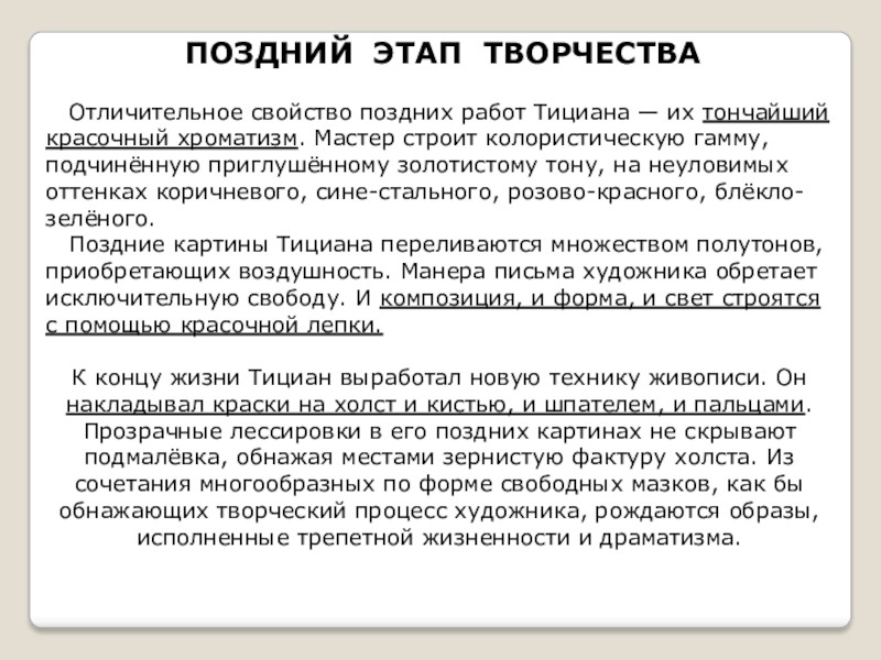 Поздние картины Тициана переливаются множеством полутонов, приобретающих воздушность. Манера письма художника обретает исключительную свободу. И композиция, и форма, и свет строятся с помощью красочной лепки.