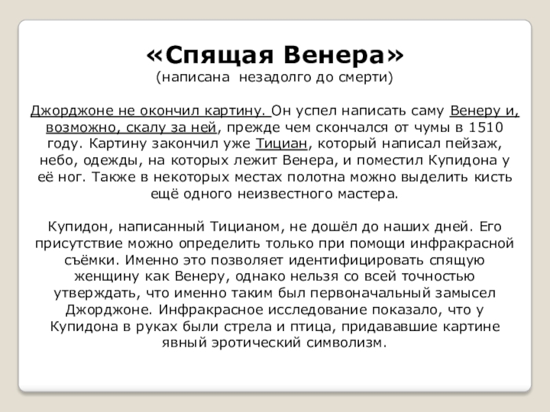 саму Венеру и, возможно, скалу за ней, прежде чем скончался от чумы в 1510 году. Картину закончил уже Тициан, который написал пейзаж, небо, одежды, на которых лежит Венера, и поместил Купидона у её ног. Также в некоторых местах полотна можно выделить кисть ещё одного неизвестного мастера.