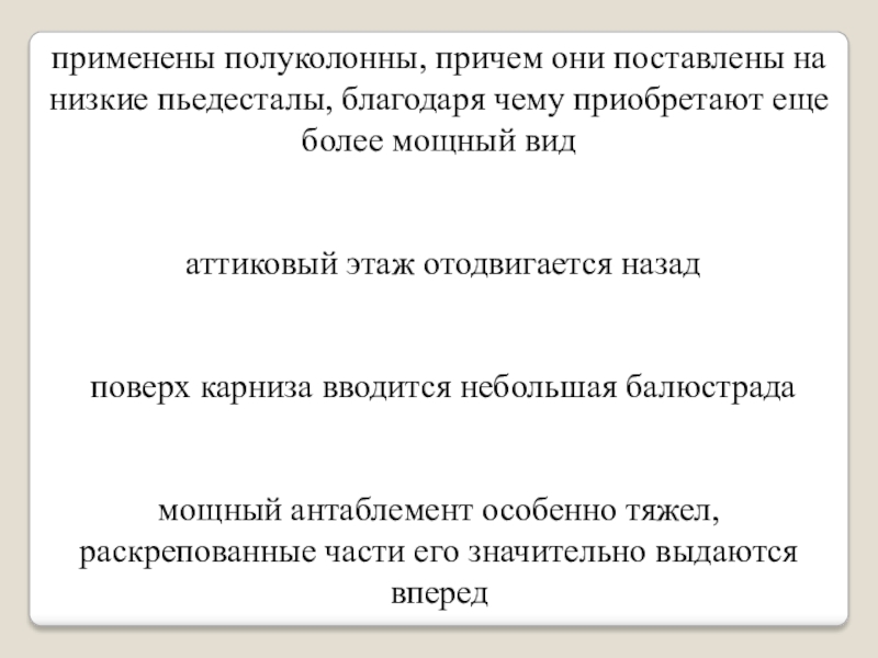 Слайд 9применены полуколонны, причем они поставлены на низкие пьедесталы, благодаря чему приобретают