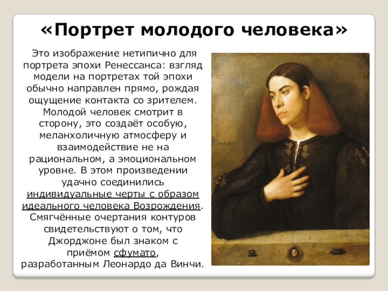 эпохи обычно направлен прямо, рождая ощущение контакта со зрителем. Молодой человек смотрит в сторону, это создаёт особую, меланхоличную атмосферу и взаимодействие не на рациональном, а эмоциональном уровне. В этом произведении удачно соединились индивидуальные черты с образом идеального человека Возрождения.