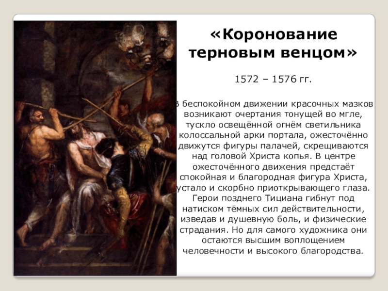 очертания тонущей во мгле, тускло освещённой огнём светильника колоссальной арки портала, ожесточённо движутся фигуры палачей, скрещиваются над головой Христа копья. В центре ожесточённого движения предстаёт спокойная и благородная фигура Христа, устало и скорбно приоткрывающего глаза. Герои позднего Тициана гибнут под натиском тёмных сил действительности, изведав и душевную боль, и физические страдания. Но для самого художника они остаются высшим воплощением человечности и высокого благородства.