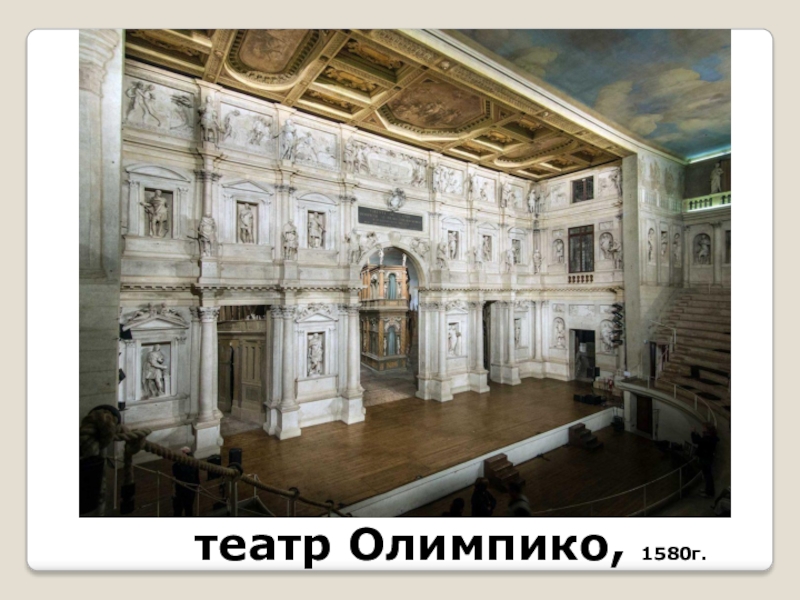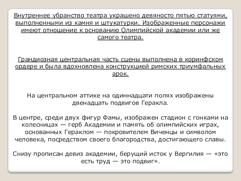 Слайд 16Внутреннее убранство театра украшено девяносто пятью статуями, выполненными из камня и