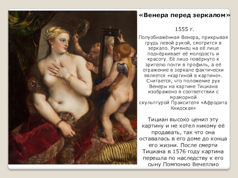 зеркало. Румянец на её лице подчёркивает её молодость и красоту. Её лицо повёрнуто к зрителю почти в профиль, а её отражение в зеркале фактически является «картиной в картине». Считается, что положение рук Венеры на картине Тициана изображено в соответствии с мраморной скульптурой Праксителя «Афродита Книдская»