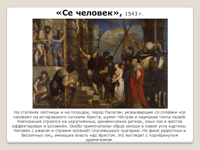со словами «се человек» на истерзанного пытками Христа, шумит пёстрая и нарядная толпа людей. Композиция строится на укрупнённых, динамических ритмах, язык поз и жестов аффектирован и усложнён. Особо примечателен образ юноши в левом углу картины. Человек с ужасом и страхом осознаёт случившуюся трагедию. На фоне радостных и беспечных лиц, имеющих власть над Христом, это выглядит с подчёркнутым драматизмом.