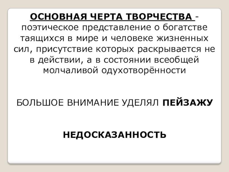 Слайд 20ОСНОВНАЯ ЧЕРТА ТВОРЧЕСТВА - поэтическое представление о богатстве таящихся в мире