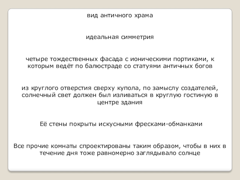 четыре тождественных фасада с ионическими портиками, к которым ведёт