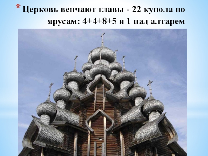 Церковь венчают главы - 22 купола по ярусам: 4+4+8+5 и 1 над алтарем