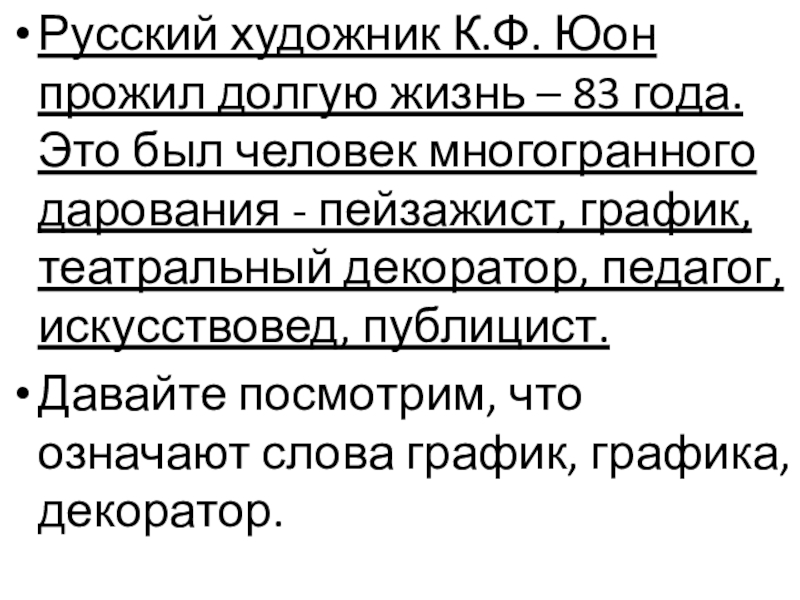 Русский художник К.Ф. Юон прожил долгую жизнь – 83 года. Это был человек многогранного дарования - пейзажист, график, театральный декоратор, педагог, искусствовед, публицист.Давайте посмотрим, что означают слова график, графика, декоратор.
